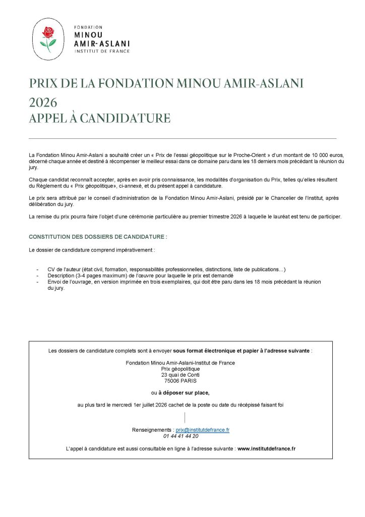 La Fondation Minou Amir-Aslani ouvre les candidatures pour l’édition 2026 de ses deux prix annuels : le Prix de l’essai géopolitique sur le Proche-Orient et le Prix Théâtre.