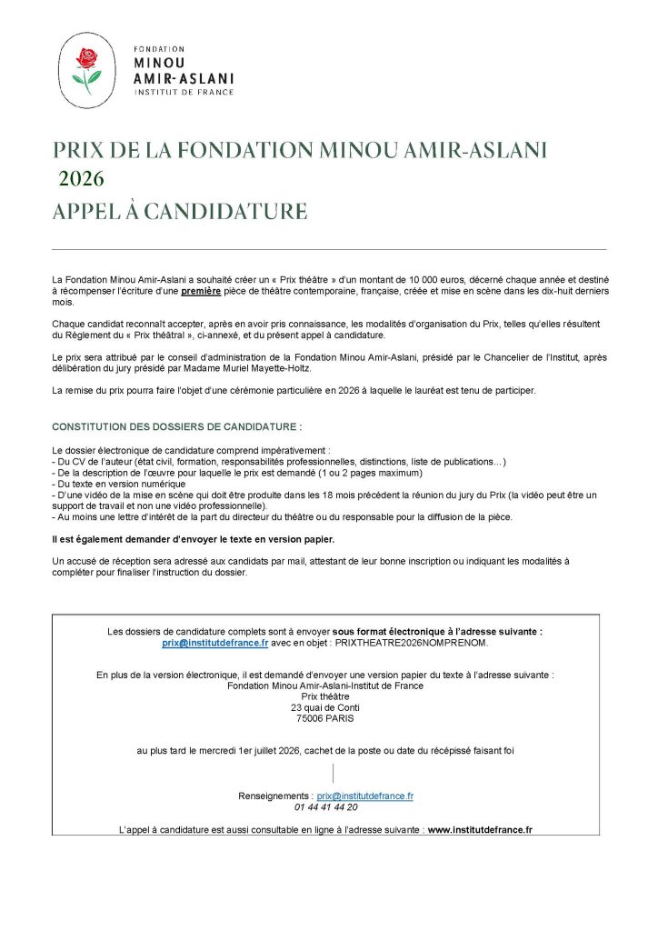 Le Prix Théâtre de la Fondation Minou Amir-Aslani soutient la création dramatique contemporaine en distinguant une première œuvre théâtrale francophone, créée et mise en scène dans les 18 derniers mois.